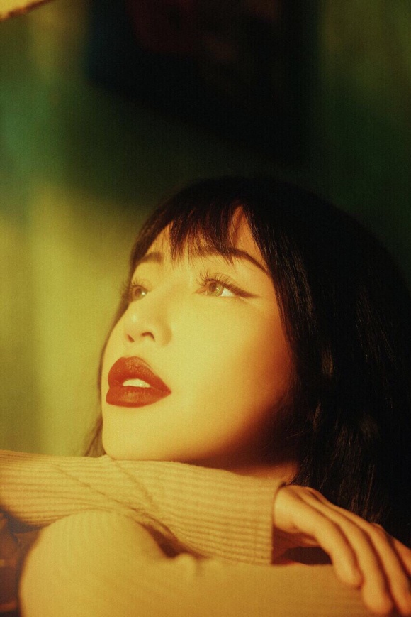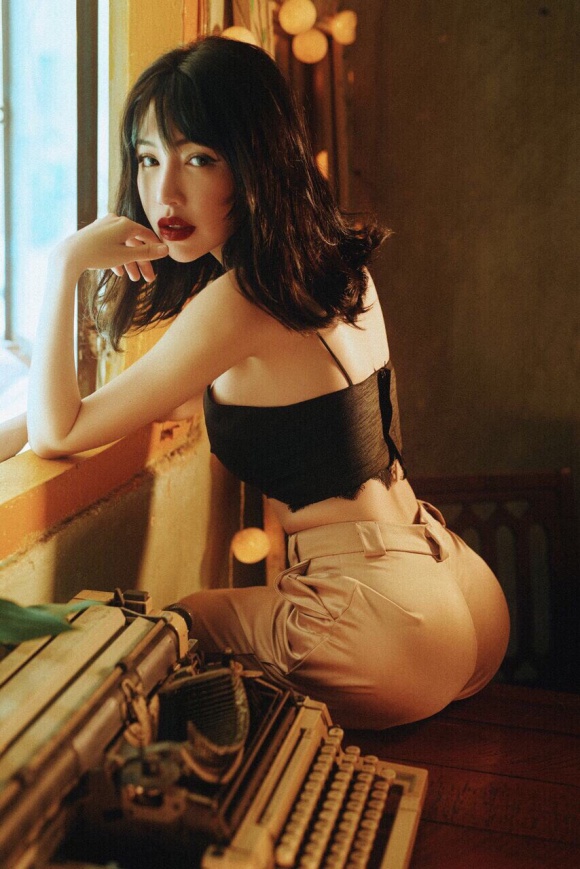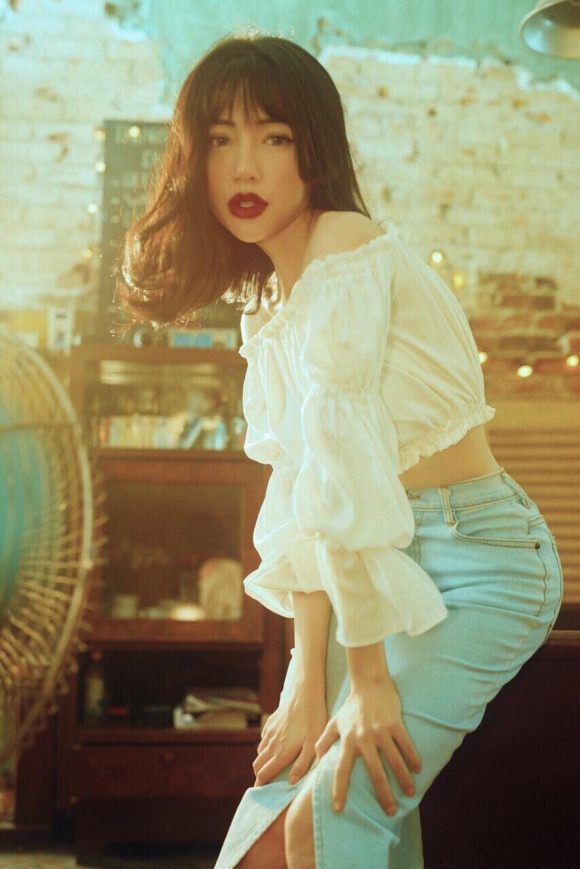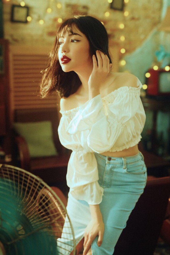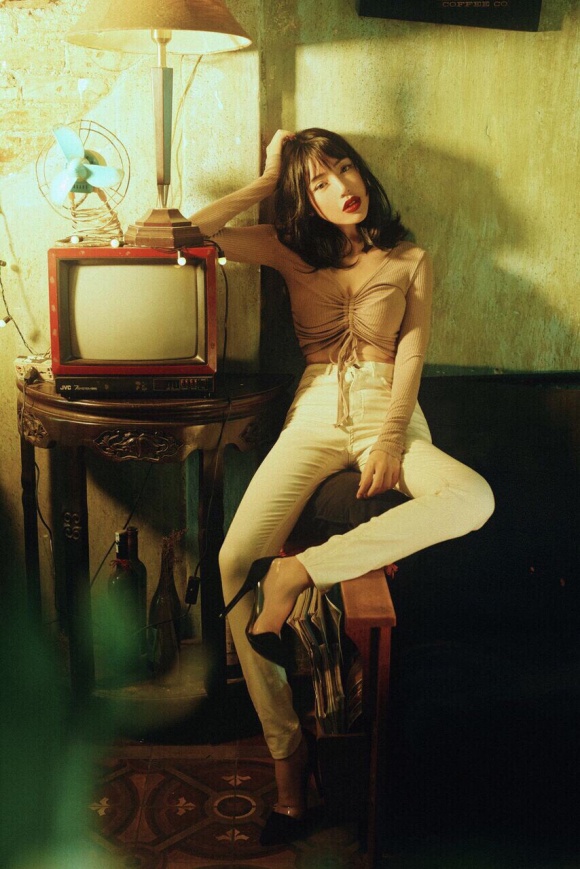 Trong không gian đậm chất cổ điển, Elly Trần khéo léo khoe vòng eo 54cm khi diện áo crop top kết hợp với quần jean. Nữ diễn viên chọn kiểu tóc trẻ trung, nổi bật với đôi môi gợi cảm trong bộ ảnh lần này.