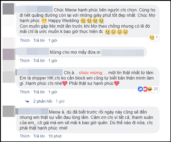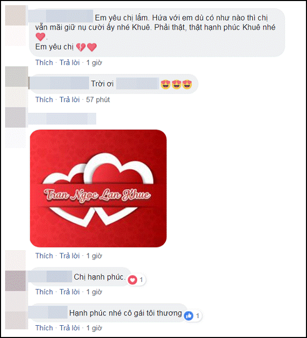 Phía dưới phần bình luận, bạn bè và người hâm mộ gửi tới Lan Khuê rất nhiều lời chúc phúc tốt đẹp. Top 11 Hoa hậu Thế giới cũng không quên nhắn nhủ fan rằng sẽ không bao giờ bỏ rơi, bởi "Supermeow là tình yêu mãi mãi". (Supermeow: tên cộng đồng người hâm mộ Lan Khuê).