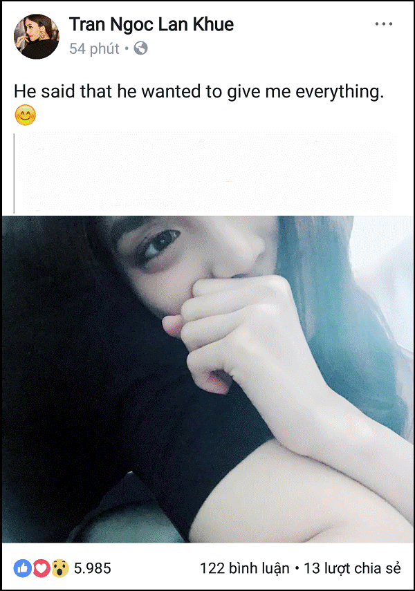 Kèm theo bức ảnh, Lan Khuê viết một dòng trạng thái ngắn gọn để tâm sự về người đàn ông này: "He said that he wanted to give me everything". (Tạm dịch: Anh ấy nói muốn cho tôi mọi thứ).
