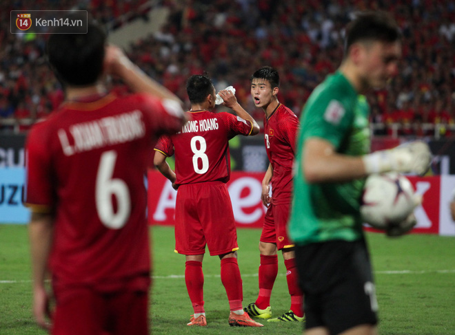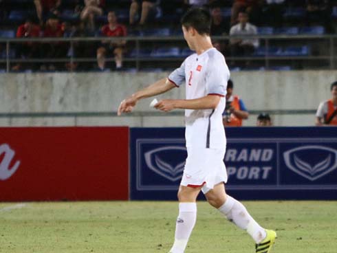 Phút 70, khi tỷ số đang là 2-0 nghiêng về phía Việt Nam, Văn Hậu nằm sân sau một pha tranh chấp trên không. Cầu thủ Việt Nam ra hiệu cho trận đấu dừng lại nhưng các tuyển thủ Malaysia vẫn tiếp tục thi đấu. Sau khi bóng ra đường biên ngang, Duy Mạnh chạy tới chỗ số 19 Akhyar Rasid "dằn mặt". Ảnh: Hiếu Lương.