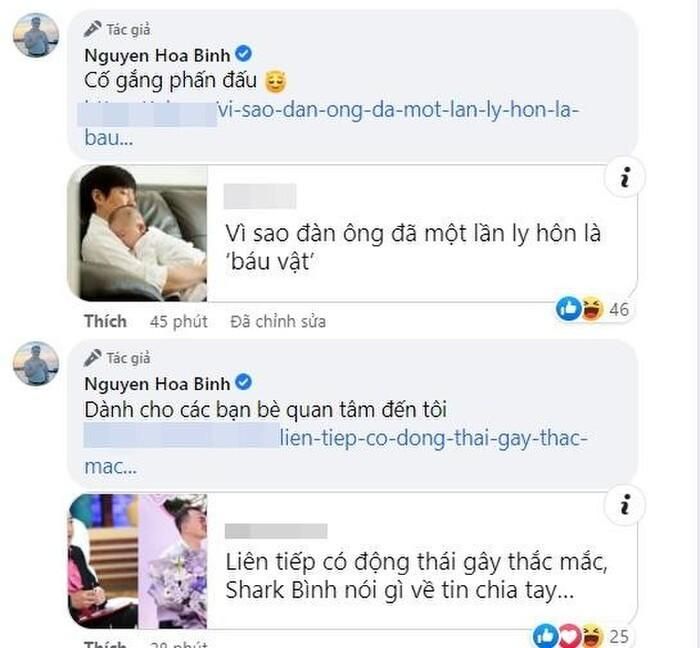 Bên cạnh đó dưới phần bình luận, nam doanh nhân còn đính kèm một đường link giải thích cho dòng trạng thái của mình, nói rõ tại sao đàn ông ly hôn một lần lại là báu vật. Anh còn tự động viên mình: "Cố gắng phấn đấu". Kèm theo lời động viên này là link bài báo lý giải "Vì sao đàn ông ly hôn một lần là báu vật?".