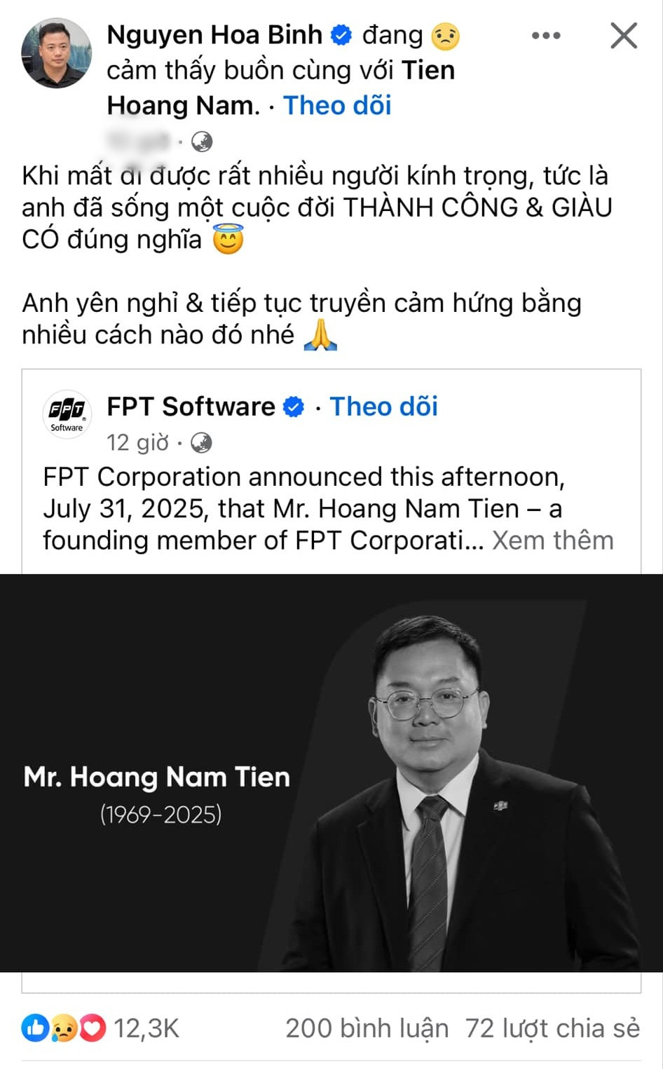 Trên trang cá nhân, Shark Bình chia sẻ bài đăng fanpage chính thức của Tập đoàn FPT kèm dòng trạng thái: