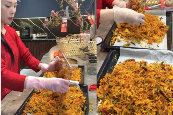 Vợ Shark Bình cho biết, năm nay cô làm 3kg thịt ức gà. Trải qua các công đoạn sơ chế, luộc gà, ướp gia vị, sấy, nữ diễn viên đã có thành quả là những khay khô gà màu vàng óng, thơm ngon đẹp mắt. Sau khi làm xong món ăn, Phương Oanh còn cẩn thận chuẩn bị hũ thủy tinh, dán nhãn "Bếp nàng Ỉn" để bảo quản, cho vào giỏ quà Tết tặng người thân.