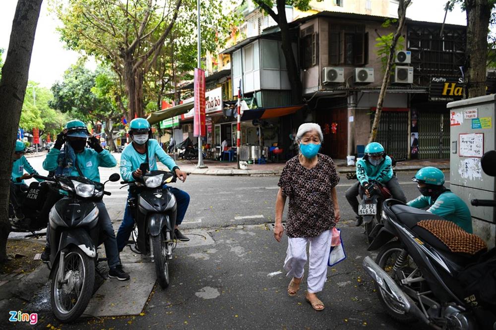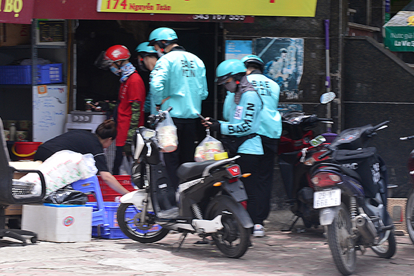 Tại một quán ăn trên đường Vũ Thạnh (Đống Đa, Hà Nội), các shipper chen chúc nhau để lấy đơn, tuy nhiên họ không đảm bảo an toàn về giãn cách phòng dịch. Còn chủ quán cũng không đeo khẩu trang khi làm việc.