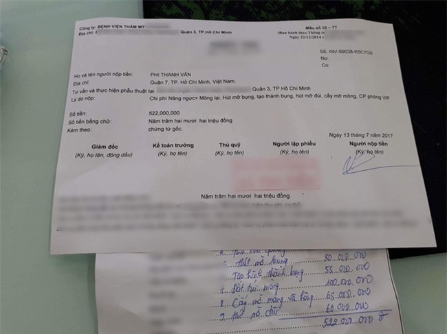Mặc dù người trong cuộc chưa tiết lộ, song có một số thông tin cho rằng ca đại phẫu lần 3 sẽ "ngốn" của Phi Thanh Vân số tiền lên tới hơn nửa tỷ. Theo một tờ hóa đơn đang được chia sẻ trên mạng, người đẹp họ Phi chịu chi tới 522 triệu đồng cho kế hoạch làm đẹp này.