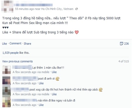 "Trong vòng 3 đồng hồ tiếng nữa, nếu lượt ''Theo dõi'' ở facebook này tăng 5000 lượt, K. sẽ Post Phim Sex lãng mạn của mình" - lại thêm một trường hợp dùng clip sex để tăng lượng theo dõi khiến cư dân mạng phải giật mình.