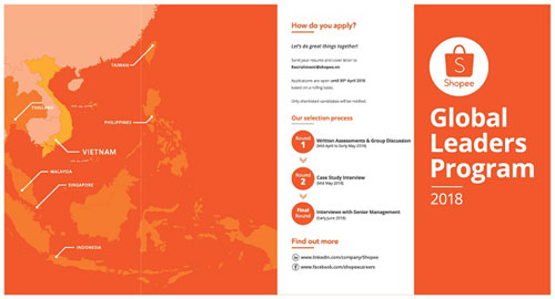 Nhà lãnh đạo toàn cầu - Global Leaders Program 2018 là chương trình tuyển dụng đặc biệt của Shopee nhằm tìm kiếm những tài năng muốn thử sức trong lĩnh vực Thương mại điện tử và có tham vọng trở thành nhân sự nòng cốt của một trong những nền tảng thương mại điện tử hàng đầu khu vực Đông Nam Á hiện nay.