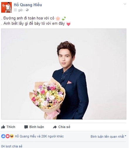 Mới đây trên trang cá nhân, Hồ Quang Hiếu chia sẻ hình ảnh lịch lãm trong trang phục vest tay cầm hoa. Đính kèm hình ảnh, giọng ca Chỉ cần em hạnh phúc hào hứng gửi lời yêu thương: "Đường anh đi toàn hoa với cỏ. Anh biết lấy gì để bày tỏ với em đây?.