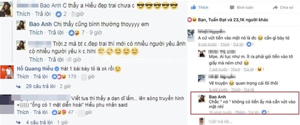 Theo đó, một số anti-fan buông lời can thiệp vào đời tư tình yêu của Hồ Quang Hiếu. Trong số đó, lời khuyên: "Anh cứ vứt tiền vào mặt nó là được, cần gì bày tỏ?" của một Facebooker được chú ý đặc biệt. Tưởng vô can, ai ngờ Bảo Anh lên tiếng đáp trả trước lời lẽ khiếm nhã của anti-fan: "Chắc nó không có tiền mà cần vứt vào mặt nhỉ?".