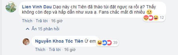Cụ thể, một tài khoản facebook đã bày tỏ quan điểm một cách thẳng thắng ở phần bình luận ngay trên trang cá nhân của Tóc Tiên : “Dạo này chị Tiên đã tháo túi đặt ngực ra rồi ạ? Thấy không còn đẹp và hấp dẫn như xưa ạ. Fans chắc mất đi nhiều”. Ngay lập tức, ca sĩ Tóc Tiên đã đáp trả với phong thái vô cũng điềm tĩnh “Ừ em”.