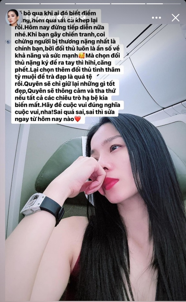 Lệ Quyên bày tỏ: "Bỏ qua khi ai đó biết điểm dừng. Hôm qua tất cả khép lại rồi. Hôm nay đừng tiếp diễn nữa nhé. Khi bạn gây chiến tranh, coi chừng người bị thương nặng nhất là chính bạn, bởi đối thủ luôn là ẩn số về khả năng và sức mạnh. Mà chọn đối thủ nặng ký để ra tay thì căng phết. Lại chọn thêm đối thủ tình thâm tỷ muội để chà đạp là quá tệ rồi. Quyên sẽ chỉ giữ lại những gì tốt đẹp. Quyên sẽ thông cảm và tha thứ nếu tất cả các chiêu trò hạ bệ kia biến mất. Hãy để cuộc vui đúng nghĩa là cuộc vui. Sai quá sai, sai thì sửa ngay từ hôm nay nào".