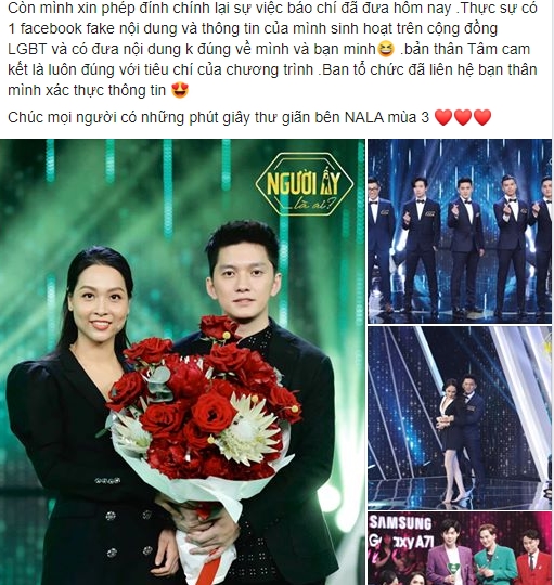 Hoàng Tâm đính chính tin đồn đồng tính trên trang cá nhân.