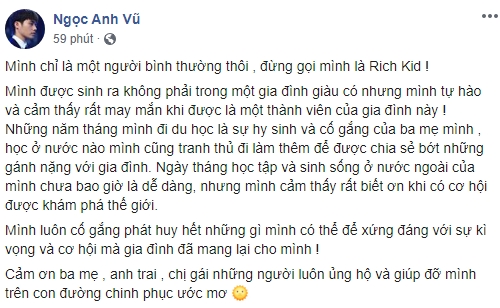 Tuy nhiên mới đây trên trang cá nhân, Vũ Ngọc Anh đã lên tiếng phản pháo về cái tên rich kid này. Anh chàng cho biết mình xuất thân trong một gia đình bình thường. Ngọc Anh cũng tiết lộ thêm, khoảng thời gian đi du học ở nước ngoài, bên cạnh nỗ lực học tập, anh cũng phải đi làm thêm bên ngoài để chia sẻ gánh nặng với gia đình. Mặc dù cuộc sống ở xứ người không dễ dàng, nhưng đó lại là cơ hội để anh được khám phá thế giới.