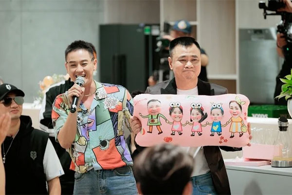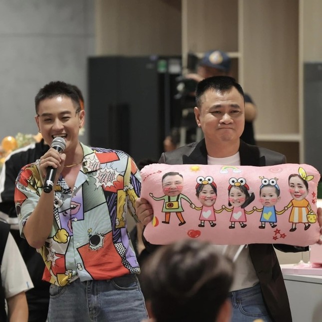 "Cảm ơn Thanh Duy rất nhiều. Nếu quà tặng là chiếc gối màu hồng, tôi chỉ thấy nó đáng yêu. Điều làm tôi bất ngờ nhất là trên gối in hình ảnh người thân của tôi, rất khó diễn tả", NSND Tự Long nói khi nhận quà.