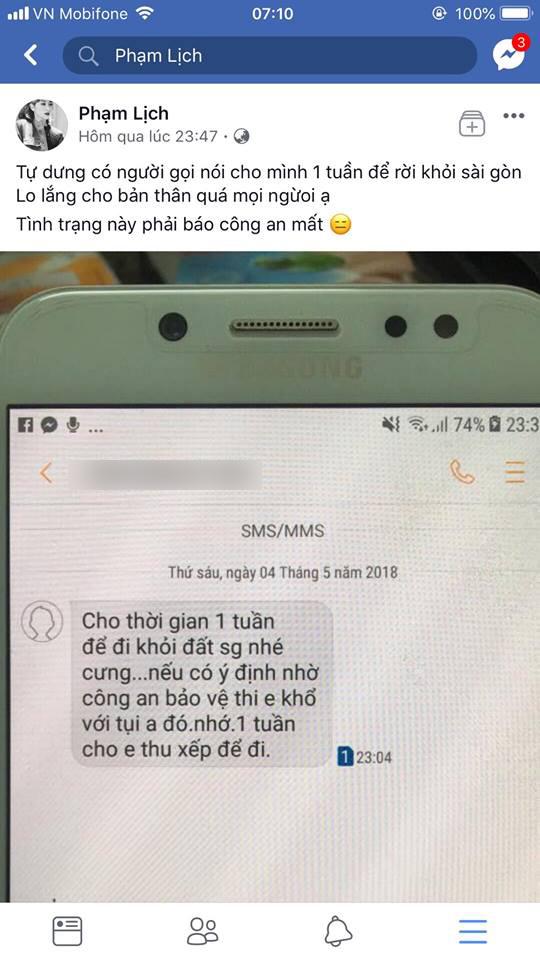 Đính kèm là dòng tin nhắn của một số điện thoại gửi tới cô với nội dung: "Cho thời gian một tuần để đi khỏi đất Sài Gòn nhé cưng. Nếu có ý định nhờ công an bảo vệ thì em khổ với tụi anh đó. Nhớ, một tuần cho em thu xếp để đi".