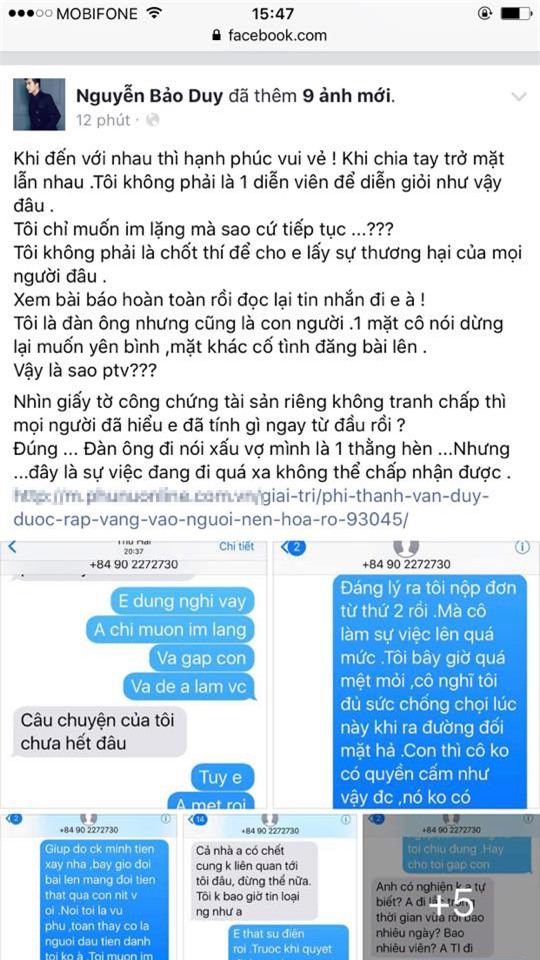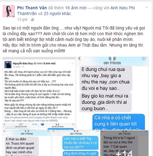 Trước đó, nữ diễn viên phim ‘Cô gái xấu xí’ ‘tố’ chồng cũ bằng việc chia sẻ hình ảnh chụp màn hình dòng trạng thái ‘kể xấu’ vợ của Bảo Duy và những tin nhắn anh gửi đến cô. Đi kèm với những hình ảnh này, Phi Thanh Vân viết dòng chú thích thu hút sự chú ý của cộng đồng mạng. ‘Sao lại có một người đàn ông…như vậy! Người mà tôi đã từng yêu và gọi là chồng đây sao? Anh chửi tôi còn tệ hơn một con thú! Khóc nghẹn tim tôi anh biết không! Sợ nhất cảnh nuôi ông tay áo, nuôi kẻ phản mình. Hãy đọc hết tin nhắn. Mình gửi cho nhau anh ạ! Thật đau lắm. Nhưng im lặng thì sẽ mang cả nỗi oan xuống mồ!’ – Phi Thanh Vân thẳng thắn.