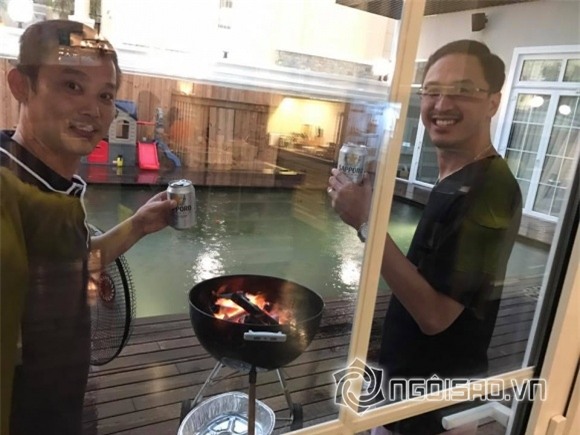 Chồng Tăng Thanh Hà uống bia cùng với bạn ở hồ bơi.