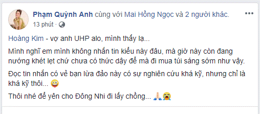 Ngay lập tức, Phạm Quỳnh Anh đã đăng tải đoạn tin nhắn lên trang cá nhân để cảnh báo mọi người về việc Facebook của Đông Nhi đang bị lợi dụng để lừa đảo. Cô viết:"Mình nghĩ em mình không nhắn tin kiểu này đâu, mà giờ này còn đang nướng khét lẹt chứ chưa có thức dậy để mà đi mua túi sáng sớm như vậy. Đọc tin nhắn có vẻ bạn lừa đảo này có sự nghiên cứu khá kỹ, nhưng chỉ là khá kỹ thôi... Thôi nhé để yên cho Đông Nhi đi lấy chồng".