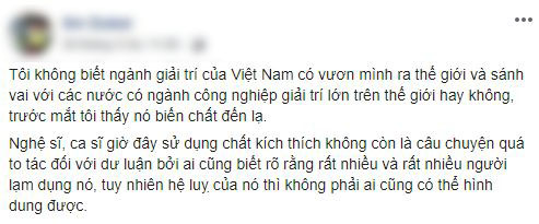 Cụ thể, bài đăng này cho biết anh cảm thấy rằng việc các nghệ sĩ, ca sĩ sử dụng chất kích thích bây giờ không quá to tát.