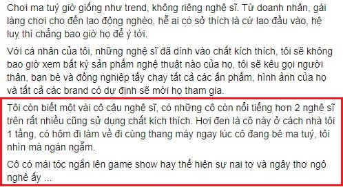 Cuối bài viết của mình, người này còn tiết lộ rằng anh còn biết một nữ nghệ sĩ tóc ngắn cũng sử dụng chất kích thích: "Tôi còn biết một vài cô cậu nghệ sĩ, có những cô còn nổi tiếng hơn 2 nghệ sĩ trên rất nhiều cũng sử dụng chất kích thích. Hơi đen là cô này ở cách nhà tôi 1 tầng, có hôm đi làm về đi cùng thang máy ngay lúc cô đang phê ma tuý, tôi nhìn mà ngán ngẩm. Cô có mái tóc ngắn lên game show hay thể hiện sự nai tơ và ngây thơ ngô nghê ấy..."