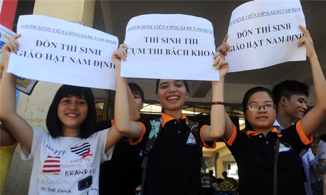 Nhóm SVTN Nam Định chào đón thí sinh và người nhà tại bến xe Giáp Bát