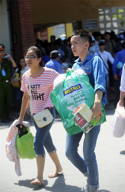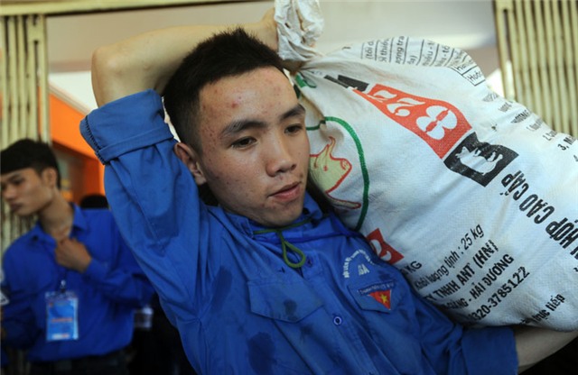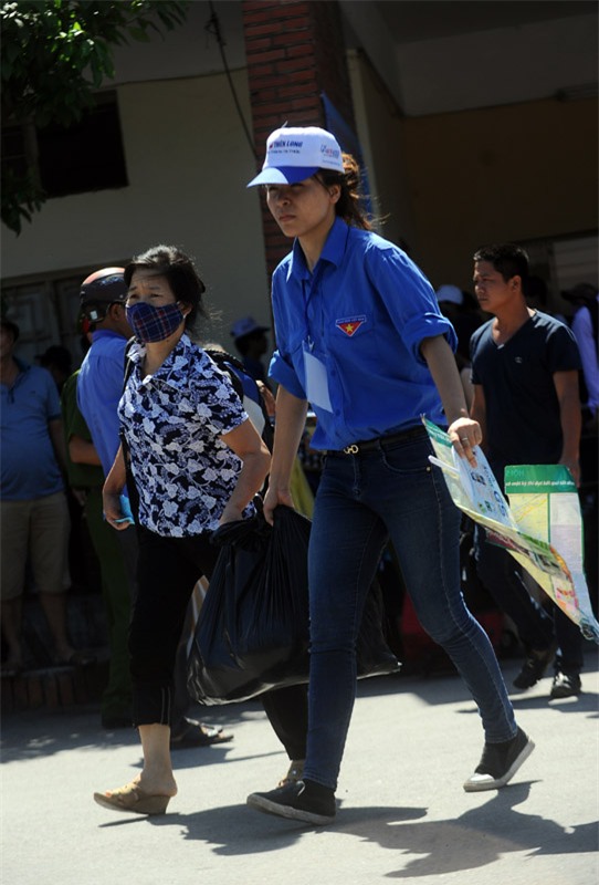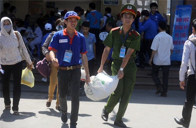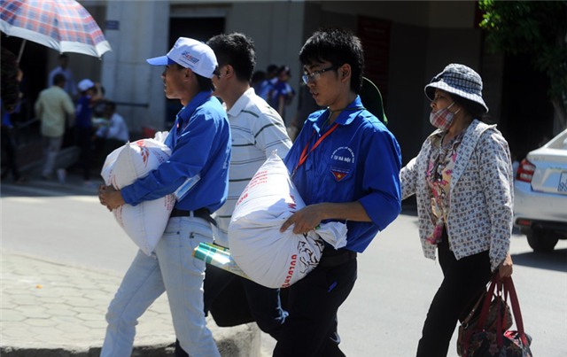 Các thanh niên tình nguyện khuân đồ giúp thí sinh và người nhà tại bến xe Giáp