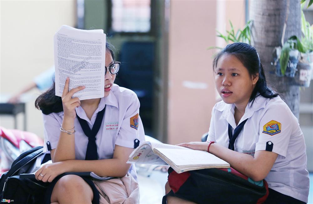 Trước giờ vào phòng thi, Tường Vy, trường Nguyễn Chí Thanh, cùng bạn tranh thủ ôn lại kiến thức đã học.