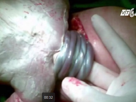 13h45 phút, ca mổ bắt đầu với sự tham gia của hai bác sĩ là phó giám đốc bệnh viện. Sau khi mổ khoang bụng, các bác sĩ cực kỳ hốt hoảng khi tử cung chị Trần thật sự đã vỡ, máu và nước ối tràn ra khoang bụng. Đến 14h, em bé đầu tiên được lấy ra, 1 phút sau em bé thứ hai chào đời. Nước ối của hai bé gần như đã cạn kiệt, chỉ cần chậm trễ thêm vài phút nữa, có thể hai bé đã chết lưu.