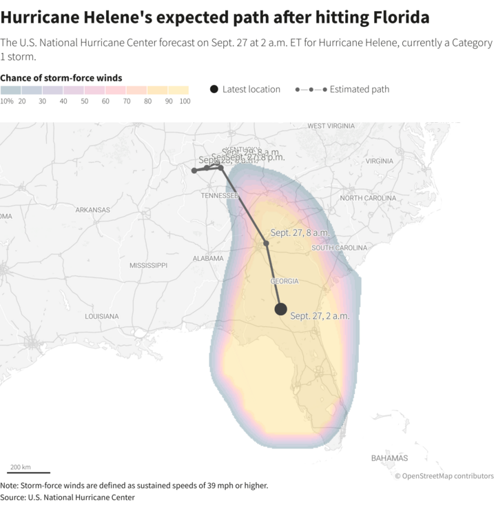 Hướng đi của bão Helene sau khi suy yếu dần thành áp thấp nhiệt đới. (Ảnh: Reuters)