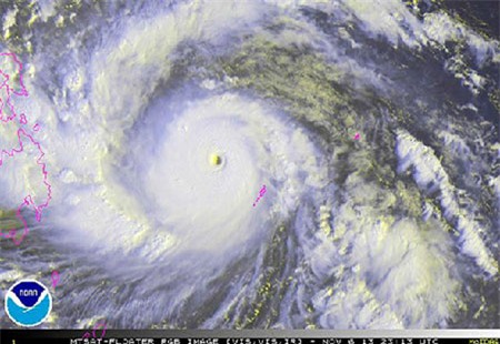Ảnh vệ tinh siêu bão Haiyan sắp đổ bộ vào Phillippines. Ảnh: NOAA |