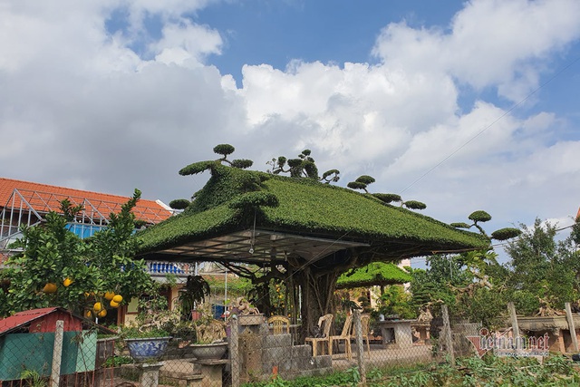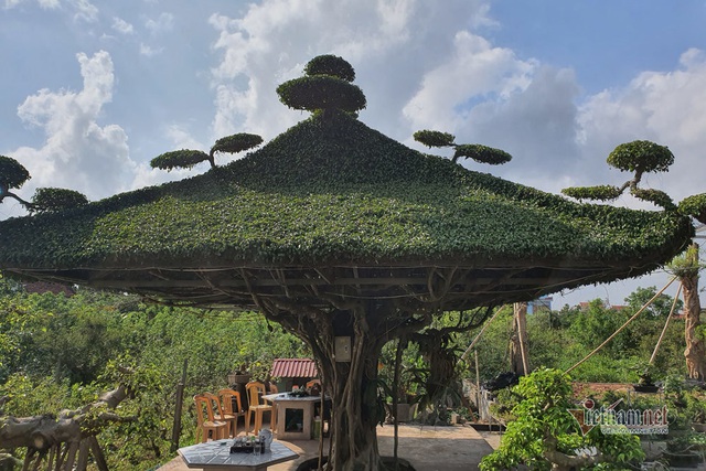 Toàn bộ phần tán cây được nghệ nhân cây cảnh quê lúa tạo dáng hình mái đình có chiều dài 7m, rộng 5m. Phần mái lên đến ngọn có độ dốc thoải, được chia đều cân đối.