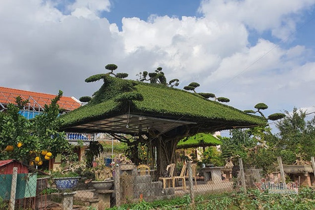 Mái đình làng quê Bắc Bộ được tái hiện bằng cây rất sinh động, họa tiết cổ như lưỡng long chầu nguyệt ở phần mái chính; các họa tiết mái vẩy cong ở bốn xung quanh, bốn con long bằng 4 tay cành chuông đều 4 góc...