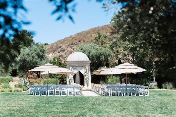Địa điểm vợ chồng Ngọc Thúy tổ chức đám cưới nằm trong khuôn viên đồng quê xanh mướt. Lễ đường lãng mạn, tràn ngập hoa tươi. |