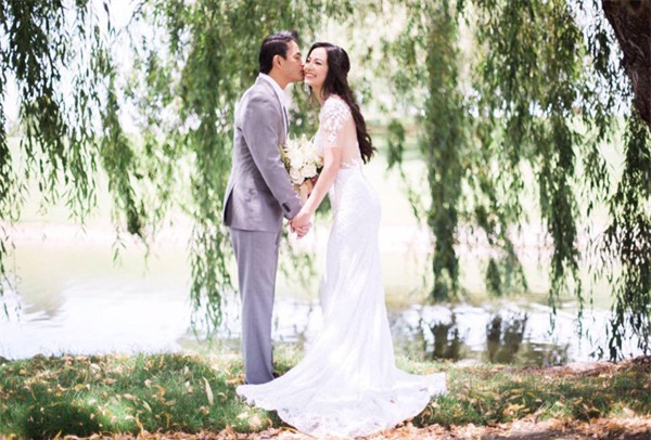 Trong những tấm ảnh cưới được thực hiện tại Mỹ, đôi uyên ương không ngừng trao cho nhau nụ hôn say đắm. |