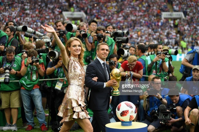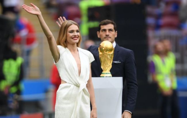 Sau khi rước cúp cùng cựu thủ môn Iker Casillas ở buổi lễ khai mạc World Cup 2018, siêu mẫu Nga Natalia Vodianova một lần nữa đồng hành với Philipp Lahm, cựu đội trưởng tuyển Đức, đưa chiếc cúp vàng ra ngoài sân vận động Luzhniki trong trận chung kết giữa Pháp và Croatia.