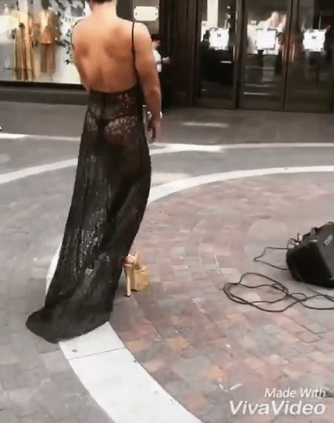 Bộ trang phục của anh chàng đô con cũng khiến người xung quanh phát hoảng bởi chất liệu vải ren xuyên thấu, thậm chí lộ nội y. Chàng trai nở nụ cười tươi tắn, sải bước nhịp nhàng theo điệu nhạc, tay xách clutch sang chảnh.