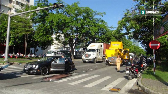Cú tông mạnh khiến siêu xe Bentley bị đẩy đi phía trước 10 mét, đuôi xe hư hỏng nặng. Container cũng bị hư hỏng nặng phần đầu.