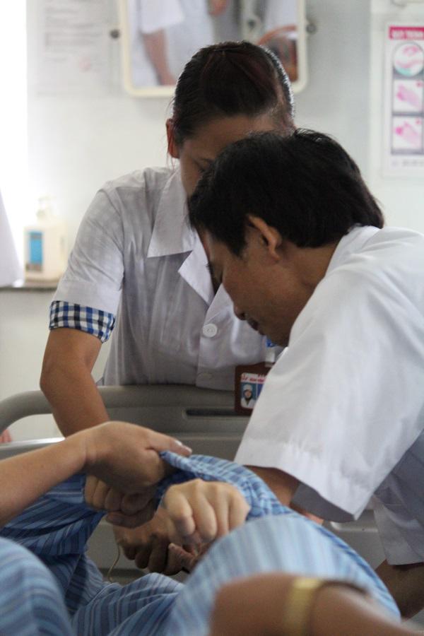 Khi gia đình đưa bệnh nhân Thuận vào viện, do bị kích động và không hợp tác điều trị, nên các bác sĩ đã phải cố định bệnh nhân bằng cách buộc chân, tay vào giường bệnh, đồng thời cho bệnh nhân ăn qua đường xông.