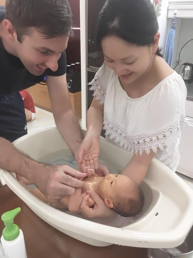 Chồng Tây phụ Lan Phương chăm sóc con khi trở về nhà.