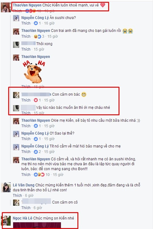 Ngay khi cô Đẩu chúc mừng sinh nhật bé Kiến, Thảo Vân và Ngọc Hà rất nhanh gửi thêm lời hay ý đẹp tới con riêng của anh. Trước tình cảm từ những người phụ nữ của bố, con gái nam danh hài đã nói lời cảm ơn. Ngoài sự lễ phép của bé Kiến, cuộc hội thoại trò chuyện thân tình của Thảo Vân với mẹ bé - vợ đầu Công Lý khiến người đọc bất ngờ.