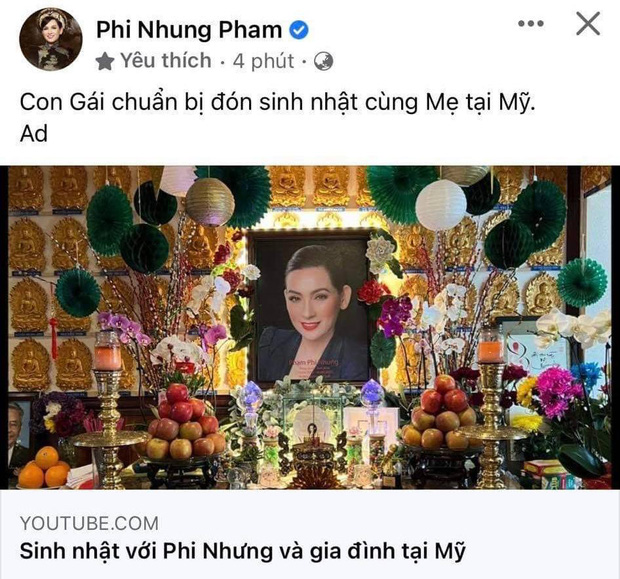 Hôm nay (ngày 10/4), cũng chính là sinh nhật lần thứ 52 của Phi Nhung. Trên Facebook cá nhân, người thân của cố ca sĩ đều có những hành động đặc biệt. Cụ thể, các con nuôi của Phi Nhung đều thắp nến tưởng nhớ đến người mẹ nuôi quá cố. Không những thế, em trai ruột nữ ca sĩ và cựu quản lý đều có những dòng trạng thái gây xúc động. Tại Mỹ, Wendy Phạm - con gái ruột của Phi Nhung cũng đã chuẩn bị mọi thứ để chúc mừng sinh nhật đặc biệt của mẹ. Có lẽ, năm nay chính là năm đầu tiên mà các con của Phi Nhung chúc sinh nhật mẹ quá cố theo cách đặc biệt, xót xa này.