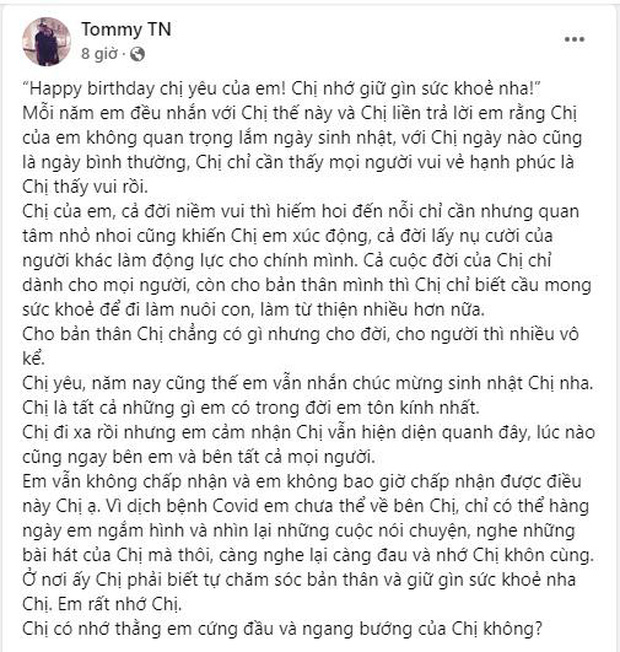 Dòng trạng thái dài của em ruột Phi Nhung. Anh cho biết mọi năm ngày này anh đều nhắn tin và nhận được hồi đáp từ Phi Nhung