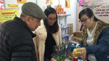Tại gian hàng bán diêm và bật lửa, hai sinh viên vừa tốt nghiệp ĐH Môi trường là Hồng Ngân (quê Hà Nội) và Thanh Mai (quê Hà Nam) vừa xoa tay hít hà cái rét ngọt mùa đông, vừa tất bật giới thiệu sản phẩm cho khách như một nhân viên bán hàng chuyên nghiệp.