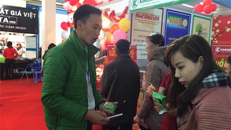 Tại gian hàng giới thiệu gạo tẻ, gạo nếp của một công ty đến từ miền Nam, nam sinh Lê Công Hiếu (sinh viên năm 4, Khoa Thú y - Trường ĐH Nông nghiệp 1 Hà Nội) vừa đưa sản phẩm thử cho khách, vừa liến thoắng giới thiệu về công ty.