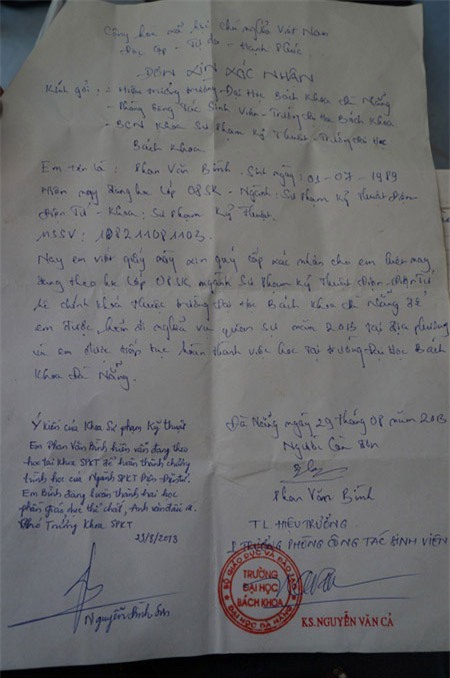 Bình cho biết: “Tháng 9/2008, em thi đậu vào Trường ĐH Bách khoa Đà Nẵng. Theo như chương trình đào tạo, em sẽ ra trường sau 45 tháng theo học. Tuy nhiên, trong quá trình học em còn đang còn nợ 2 học phần (Anh văn đầu ra và Giáo dục thể chất) nên chưa thể ra trường. Do đó, em phải tiếp tục theo học. Kỳ học năm 2013 - 2014, với thời gian 4 tháng, nếu vượt qua hai học phần này, sẽ tốt nghiệp nhưng tháng 6/2013, em đã nhận được giấy khám sức khỏe tuyển nghĩa vụ quân sự của địa phương. Trong đợt khám này, em đã trúng. Như vậy, em phải bảo lưu kết quả để lên đường và tiếp tục học sau khi ra quân”.
