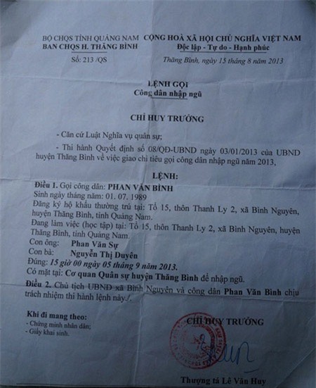 Lệnh gọi lên đường nhập ngũ đối với Bình. |