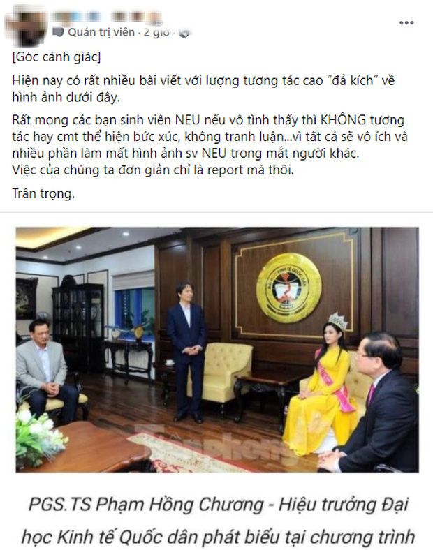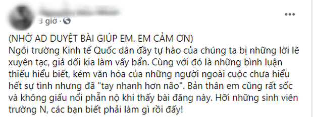 Bên cạnh đó, sinh viên NEU cũng kêu gọi report các bài viết có ý kiến tiêu cực về hình ảnh này. Bạn H.Đ (quản trị group sinh viên của trường ĐH Kinh tế Quốc dân) cho biết: "Hiện nay xuất hiện rất nhiều bài viết có lượt tương tác cao đả kích về hình ảnh này. Rất mong các bạn sinh viên NEU nếu vô tình thấy thì không tương tác hay bình luận thể hiện bức xúc, không tranh luận... Vì tất cả đều vô ích và phần nhiều làm mất đi hình ảnh sinh viên NEU trong mắt người khác. Việc của chúng ta chỉ đơn giản là report thôi".