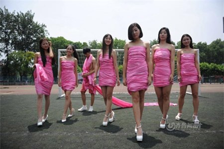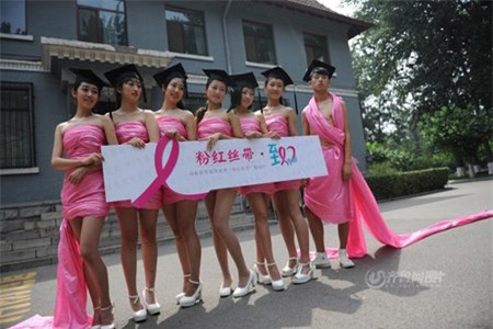 Nhóm sinh viên này chỉ quấn trên người một dải ruy băng hồng hở hang, đầu đội chiếc mũ cử nhân và tạo dáng chụp ảnh nhí nhố, xa rời với ý nghĩa của chiến dịch. |