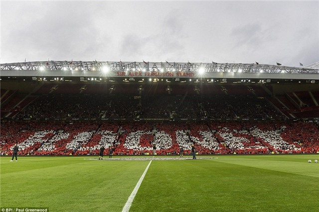 Trên khán đài "Sir Alex Ferguson", cổ động viên MU tạo thành hình tên Rooney màu trắng. |