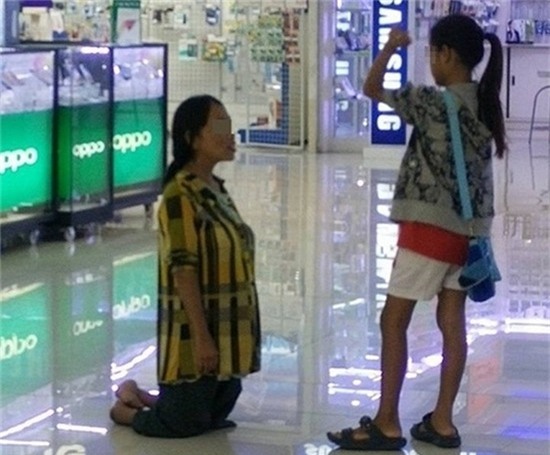 Người chứng kiến câu chuyện đã chụp lại và chia sẻ hình ảnh một bà mẹ khuyết tật ở chân đang quỳ trước mặt con gái giữa trung tâm mua sắm chỉ vì không có đủ tiền mua cho đứa con gái 15 tuổi một chiếc điện thoại mà cô mong muốn.